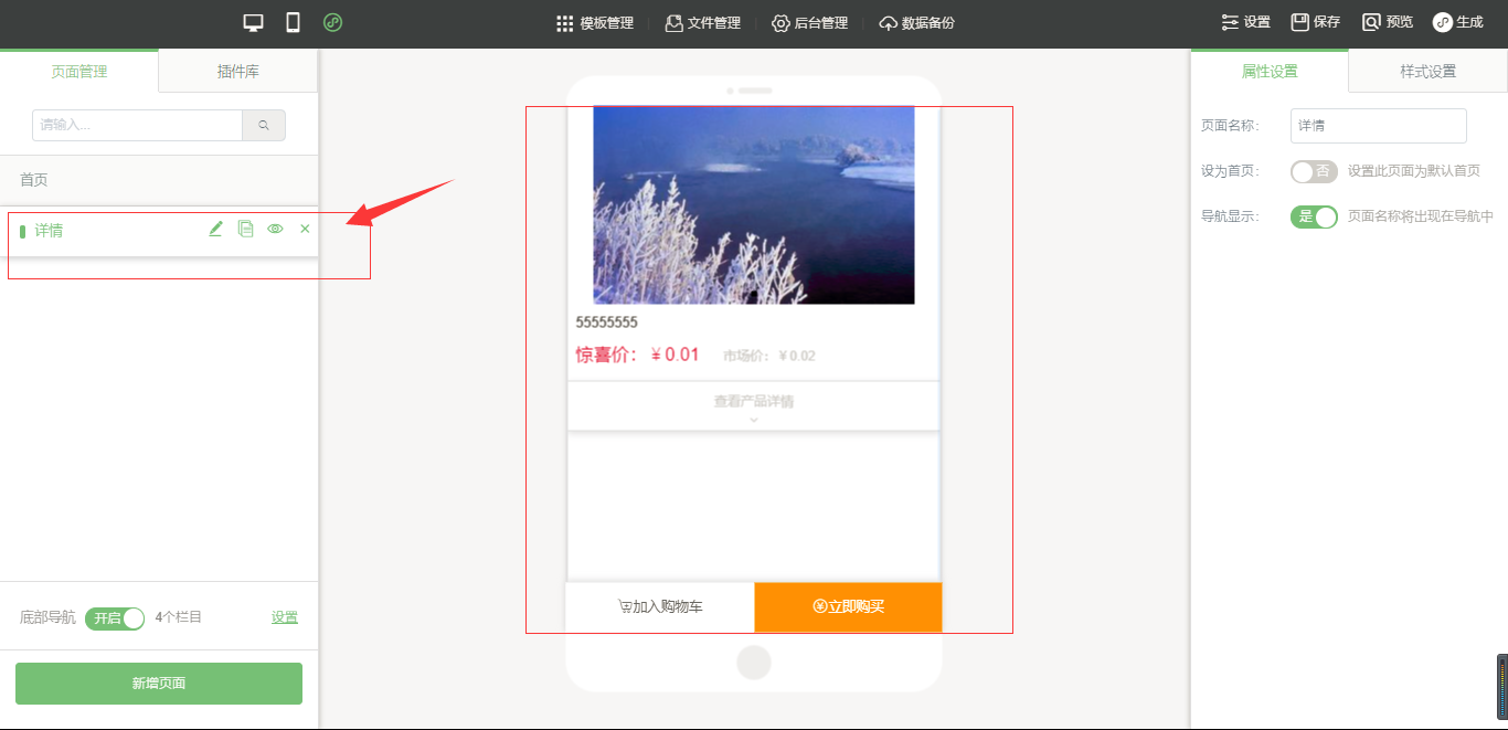 1.点击“后台管理”-“添加产品”-选择“团购”,然后添加产品信息,添加完成之后,点击“保存”,在小程序编辑器中拖入“团购列表”插件。点击选中该插件,在页面的右侧,有“属性设置”和“样式设置”,“属性设置”包括“排序设置”、“显示设置”等、“样式设置”包括“背景设置”、“边框设置”、“文字设置”、“图片设置”、“分割线设置”、“间距设置”,设置完毕后,点击保存,然后新建一个“团购详情”页面,拖入“...